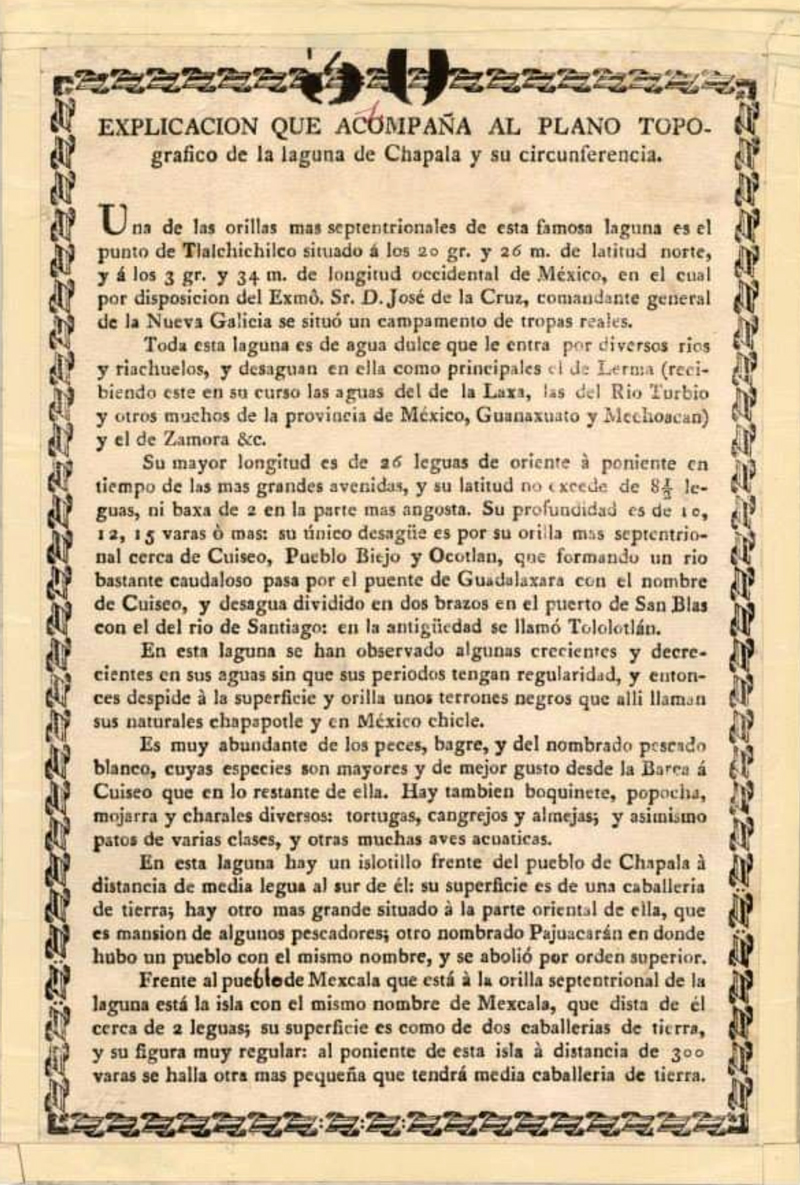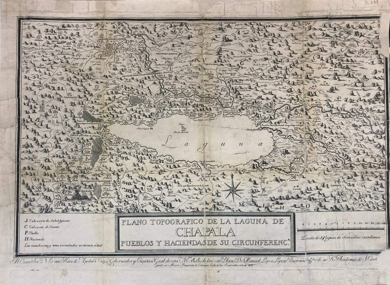 Plano Topográfico de la Laguna de Chapala Pueblos y Haciendas de su Circunferencia 1816 Grabó en México Manuel López López Imprenta de Estampas. Calle de las Escalerillas año de 1816 41x58 cm.