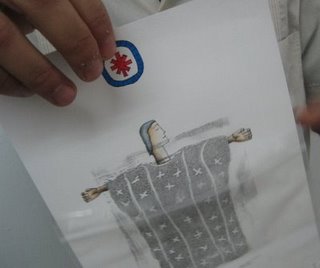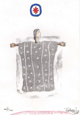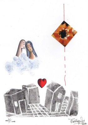 color, tinta de grabado, fotografía, hilo y pintura acrílica sobre papel Marthazul y Augusto Metztli Invierno de 2008 De antemano gracias por