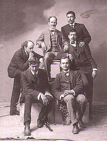 Félix Bernardelli (al centro) con sus discípulos, ca. 1898. En el sentido de las manecillas del reloj: José María Lupercio, Rafael Ponce de León, un alumno no identificado, Jorge Enciso y Gerardo Murillo Foto: CENIDIAP Laura Gonzáez Matute