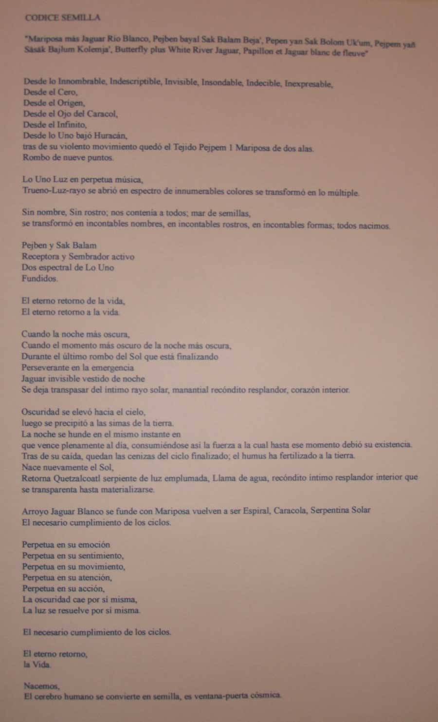 Indecible, Inexpresable, Desde el Cero, Desde el Orígen, Desde el Ojo del Caracol, Desde el Infinito, Desde lo Uno bajó Huracán, tras de su violento movimiento quedó el Tejido Pejpem Uno, Mariposa de