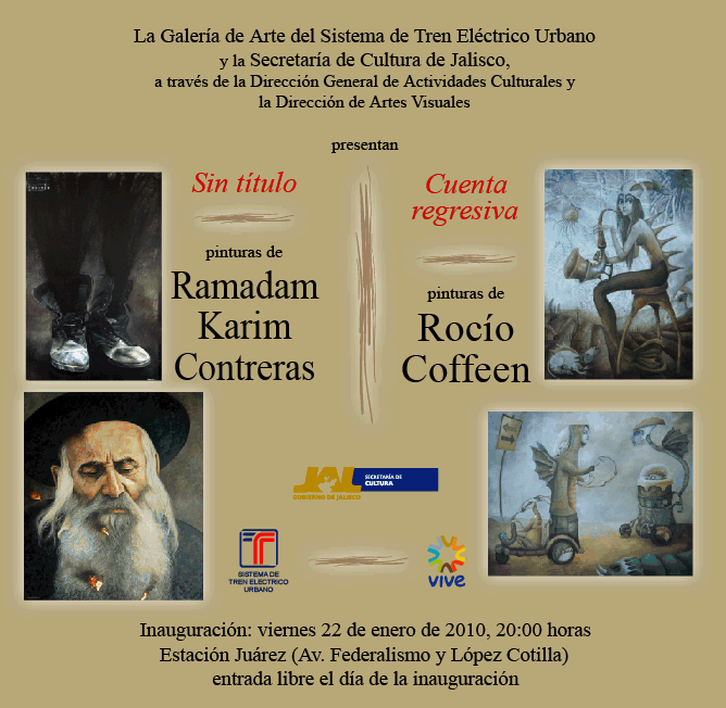 Rocío Coffeen expone Cuenta regresiva, integrada por 12 piezas GUADALAJARA, JALISCO.- Una mirada al pasado en el trabajo de Rocío Coffeen y otra más a la obra realizada por Ramadam Karim es lo que la Dirección de Artes Visuales de la Secretaría de Cultura (SC) de Jalisco presenta en la Galería de Arte de la Estación Juárez del Sistema de Tren Eléctrico Urbano (Siteur) a partir de hoy, cuando se inauguren las muestras de ambos creadores. Rocío Coffeen expone Cuenta regresiva, integrada por 12 piezas que, en su conjunto, representan lo mejor de la artista realizado en los últimos seis años. La muestra sin título de Ramadam Karim también ofrece una invitación a viajar a su trabajo pictórico de años anteriores. “Es un pequeño recuento de mi obra y qué mejor espacio que el Tren Ligero para hacerlo e invitar al espectador a detenerse a mirar el tiempo transcurrido en mi obra, para quienes me conocen y los que no”, explica Coffeen. Agrega que se siente afortunada de poder exhibir su obra en un espacio extramuros, además de que dicha galería se encuentra en un lugar privilegiado, ya que sirve de paso para gran parte de la población que utiliza el tren y que “es gente que le gusta el arte, pero desafortunadamente no tiene tiempo para ir a las expos en galerías. Entonces, está padrísimo poder hacer la expo aquí en la Estación Juárez, porque generalmente cuando va la gente a las expos es nada más a la inauguración, después es muy difícil que la gente asista”. El mundo fantástico en el que habitan los diferentes personajes de su obra tienen influencia de Remedios Varo y Leonora Carrington. Sin embargo, la artista refiere que la mayor influencia le ha llegado por su hermano Carlos Coffeen. “Es una herencia que me dejó mi hermano. Era increíble verlo trabajar en una hoja en blanco sólo con tinta china y ver los mundos fantásticos que creaba, incluso caóticos y tormentosos a veces. Aunque él estaba mucho más inmerso en el surrealismo, sus mundos caóticos que comento fueron una gran influencia para mí”, explica la creadora plástica. Sobre los temas más recurrentes en su obra, señala que son “la soledad, el vacío, el abandono, los miedos, las obsesiones, los inquilinos que de repente habitan en la mente de uno y que luego se proyectan en el lienzo”. La de Rocío Coffeen ha sido incluida para ilustrar algunas publicaciones como La gota justa de agua, Sirenario y Cuentan de algunas letras. La inauguración de la muestra Cuenta regresiva y la exposición de Ramadam Karim es hoy, a las 20:00 horas, en la Estación Juárez del Tren Ligero. La entrada es libre sólo para la inauguración. CRÉDITOS: Informador |
